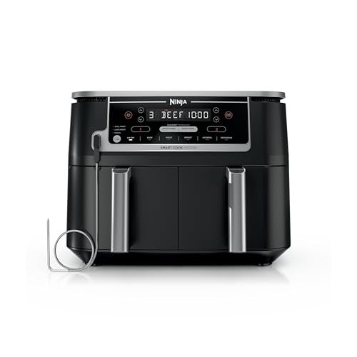 Ninja Foodi DualZone offers two independent baskets for simultaneous cooking. It includes smart cook thermometer and Match Cook technology. This allows perfect cooking control and convenience. It supports multiple functions like air fry, roast, bake, and dehydrate. Ideal for diverse cooking needs in one device.