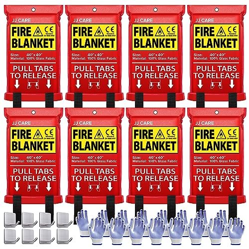 JJ Care Fire Blanket – 8 Packs with Hooks and Gloves – Emergency Fire Blanket for Home & Kitchen, High Heat Resistant Fire Suppression Blankets for Home Safety, Kitchen, and Camping