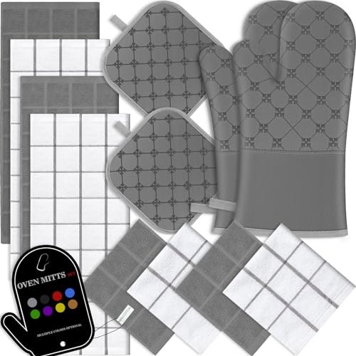 The set’s complete 12-piece assortment includes everything you need for a variety of kitchen tasks, from drying dishes to protecting your hands from hot surfaces. The gray color adds a touch of elegance to your kitchen decor while being practical for everyday use. Although the set is slightly bulkier than some alternatives, its durability and comprehensive design more than compensate for this, making it a valuable addition to any kitchen.