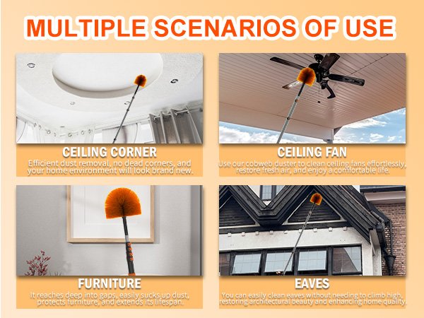 An extendable duster helps reach high ceiling corners safely. It removes dust and cobwebs without a ladder.