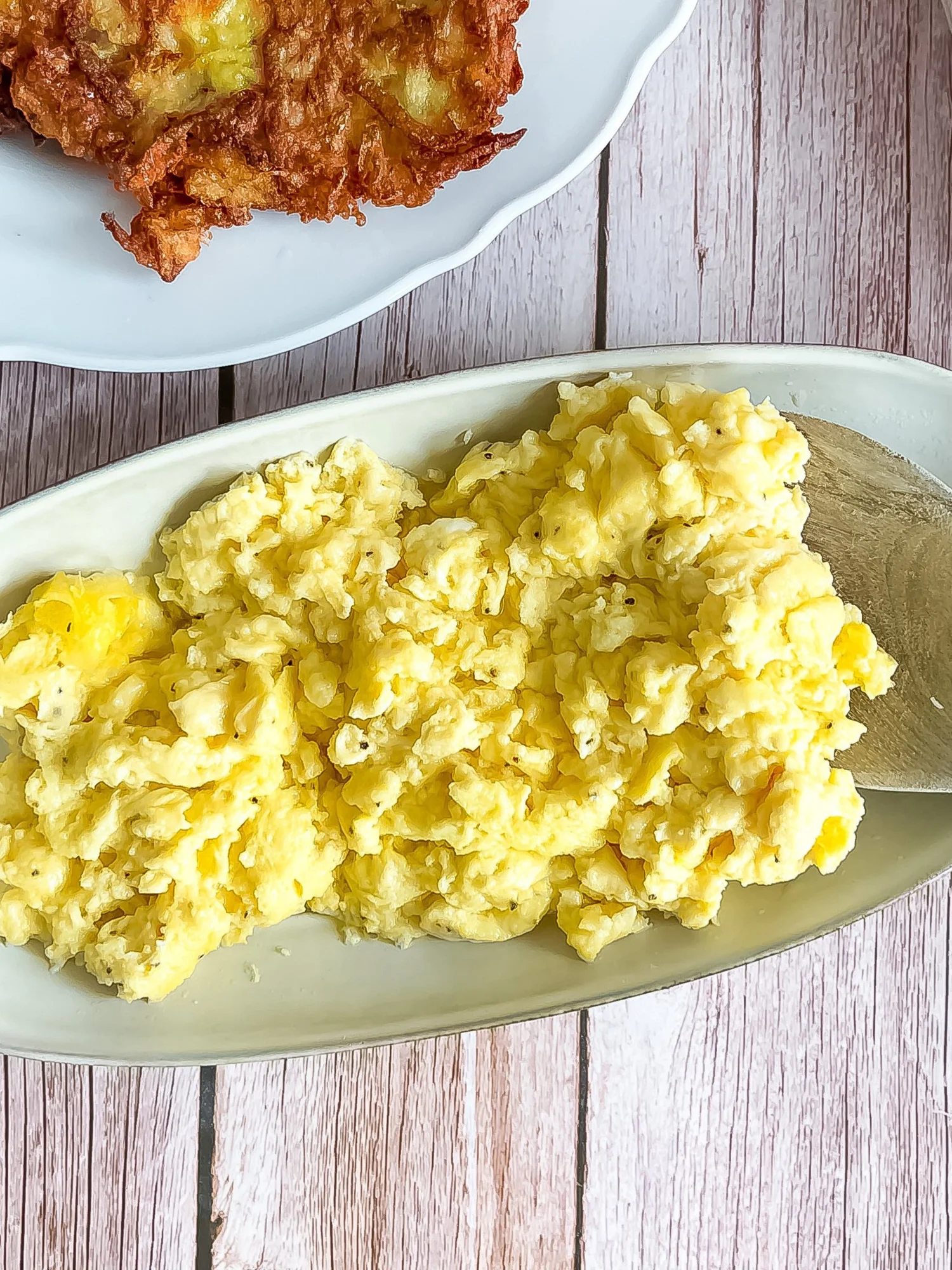 Cream makes scrambled eggs rich and soft. Use heavy cream or half-and-half for the best creaminess.