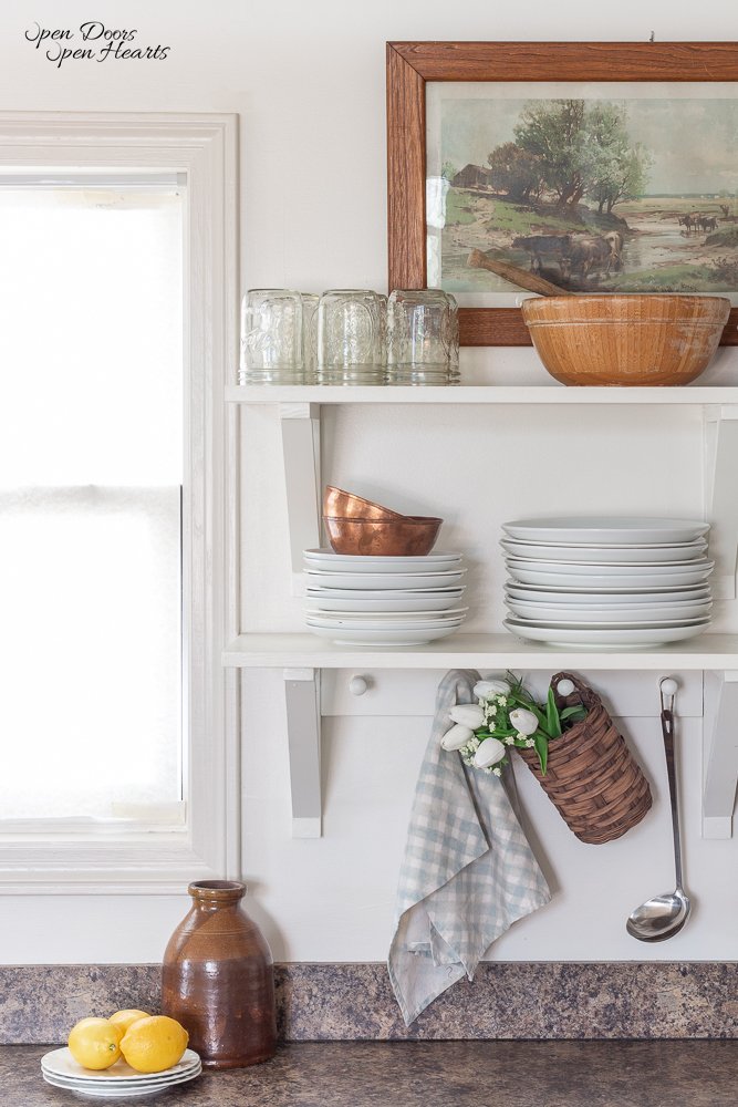 Shelves in the kitchen are great for storage and style. Adding decorative elements makes the space warm and inviting.
