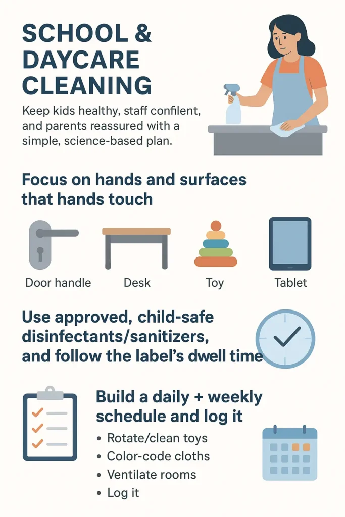 High-touch surfaces need frequent cleaning. This keeps germs low and spaces safer.