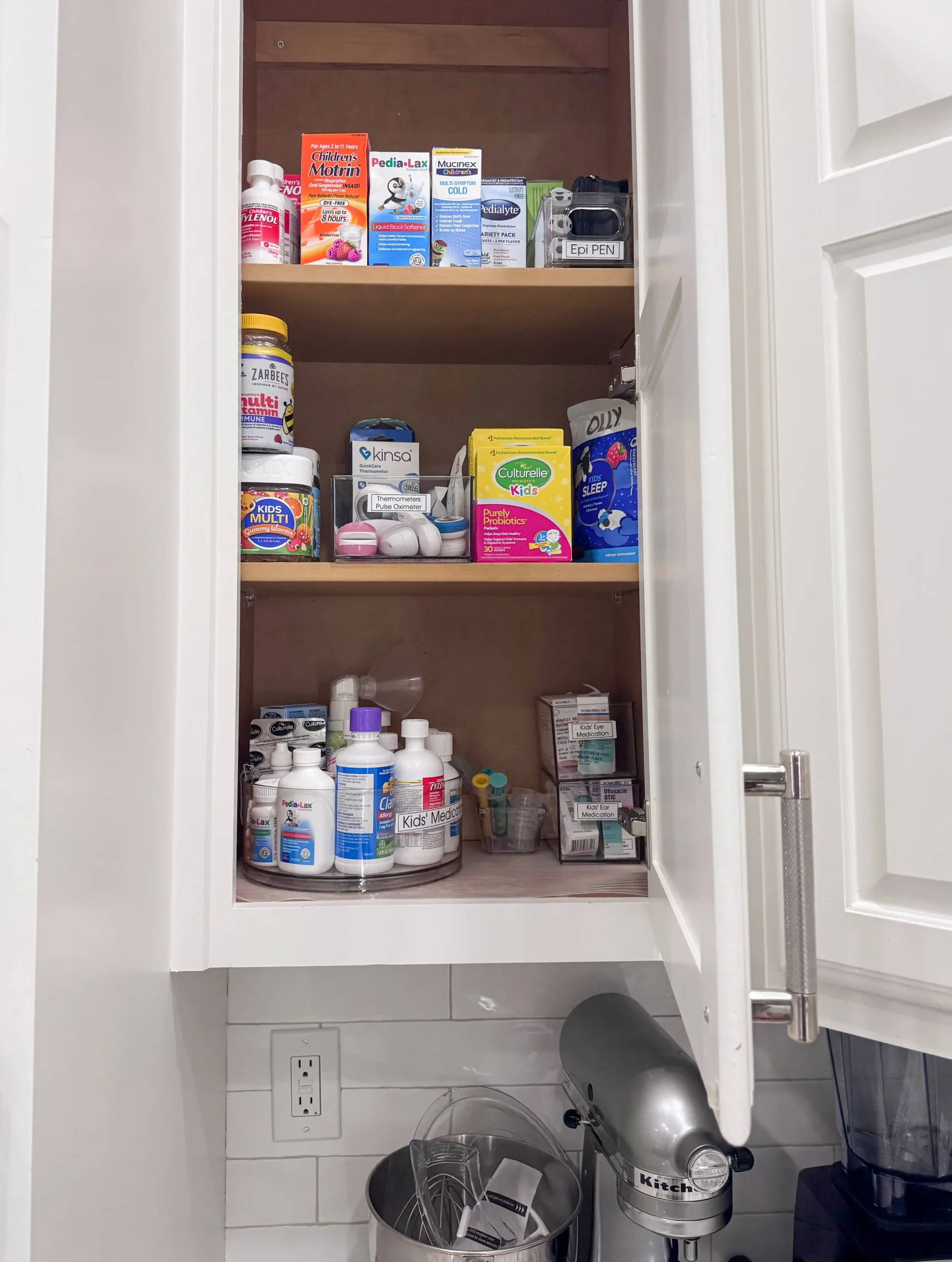 Use the height of the cabinet by adding vertical dividers. This keeps items standing up and easy to see.