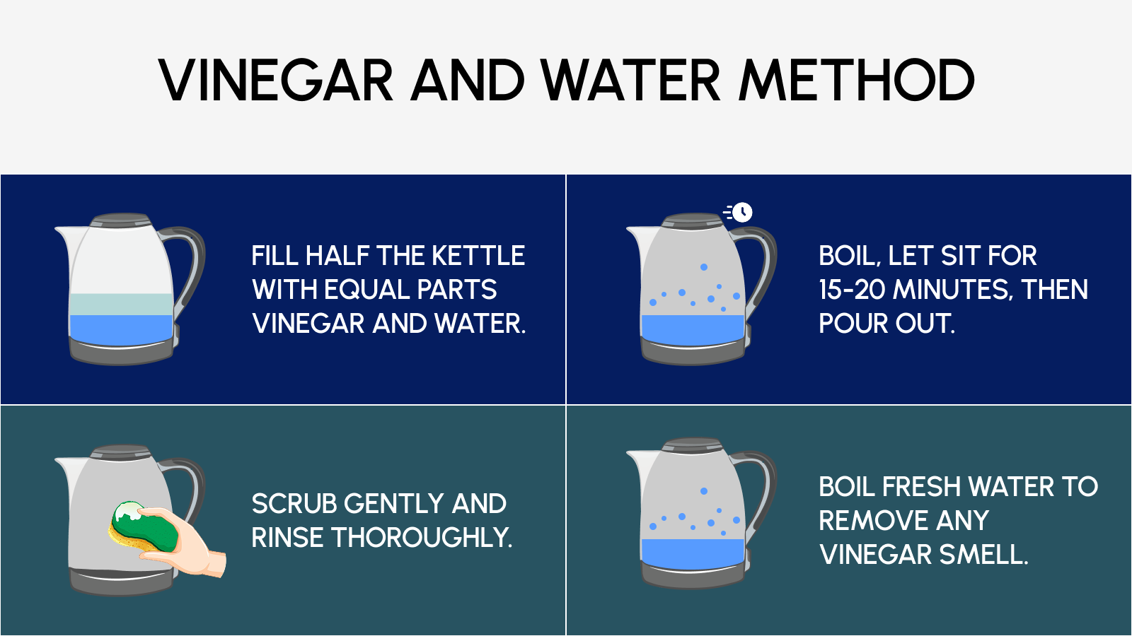 - Fill the kettle with equal parts water and white vinegar. Boil and let sit for one hour.