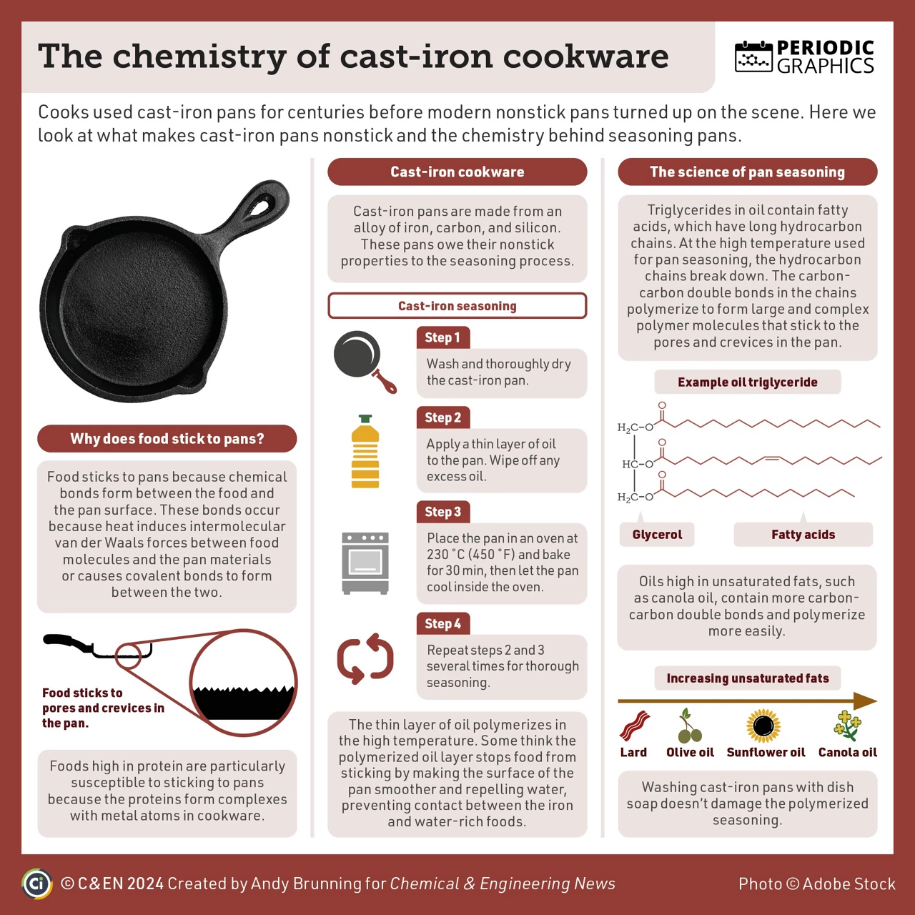 Seasoning cast iron pans protects them from rust. It also creates a natural non-stick surface.