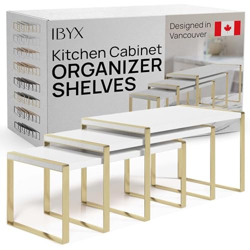 Ibyx Premium Kitchen Cabinet Organizer Shelf - Set of 3 Kitchen Counter Shelves (White Bamboo + Gold Frame, Set of 3)
