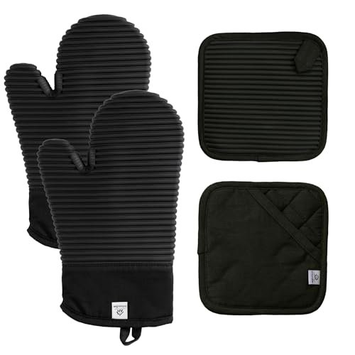 - Includes a 4-piece set with both mitts and pot holders.
